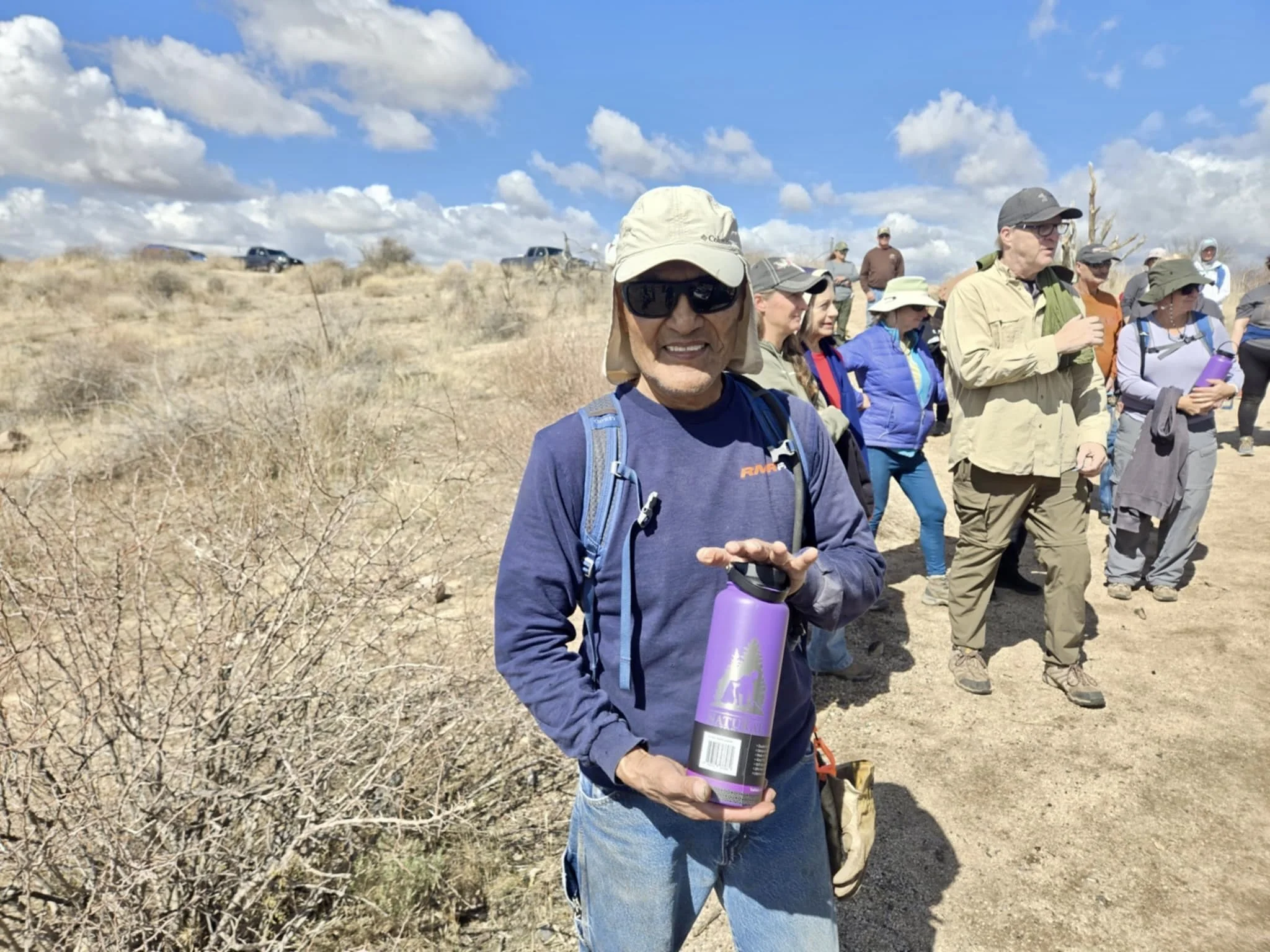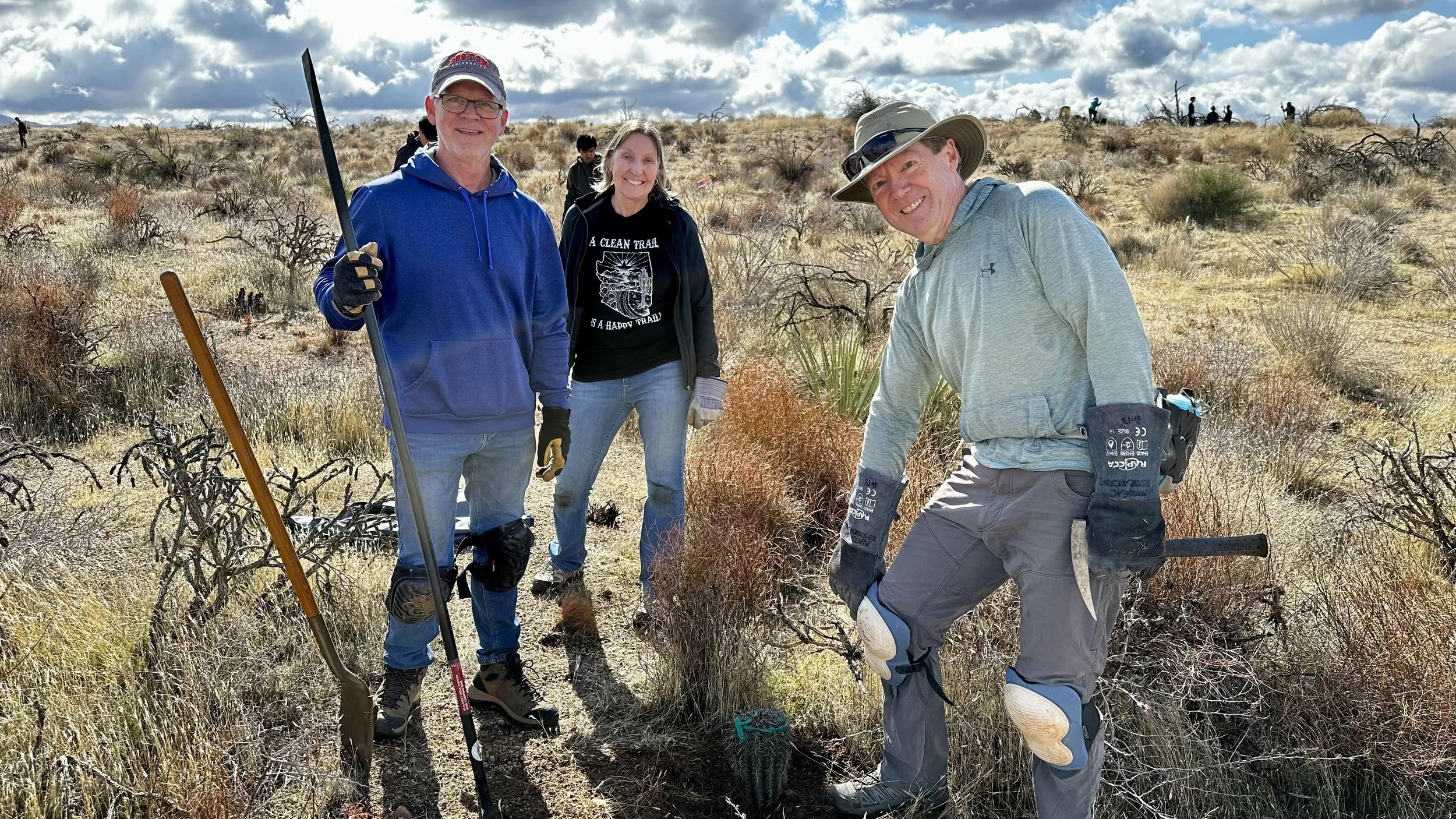 Volunteers worked in groups to get each saguaro from the staging area, using special leather/kevlar gloves to protect their hands, over to a suitable planting location. Once they had locations selected, they began digging holes, putting the saguaros in the ground with the marking tape knot facing north, making sure they are not too deep, too shallow, or leaning.