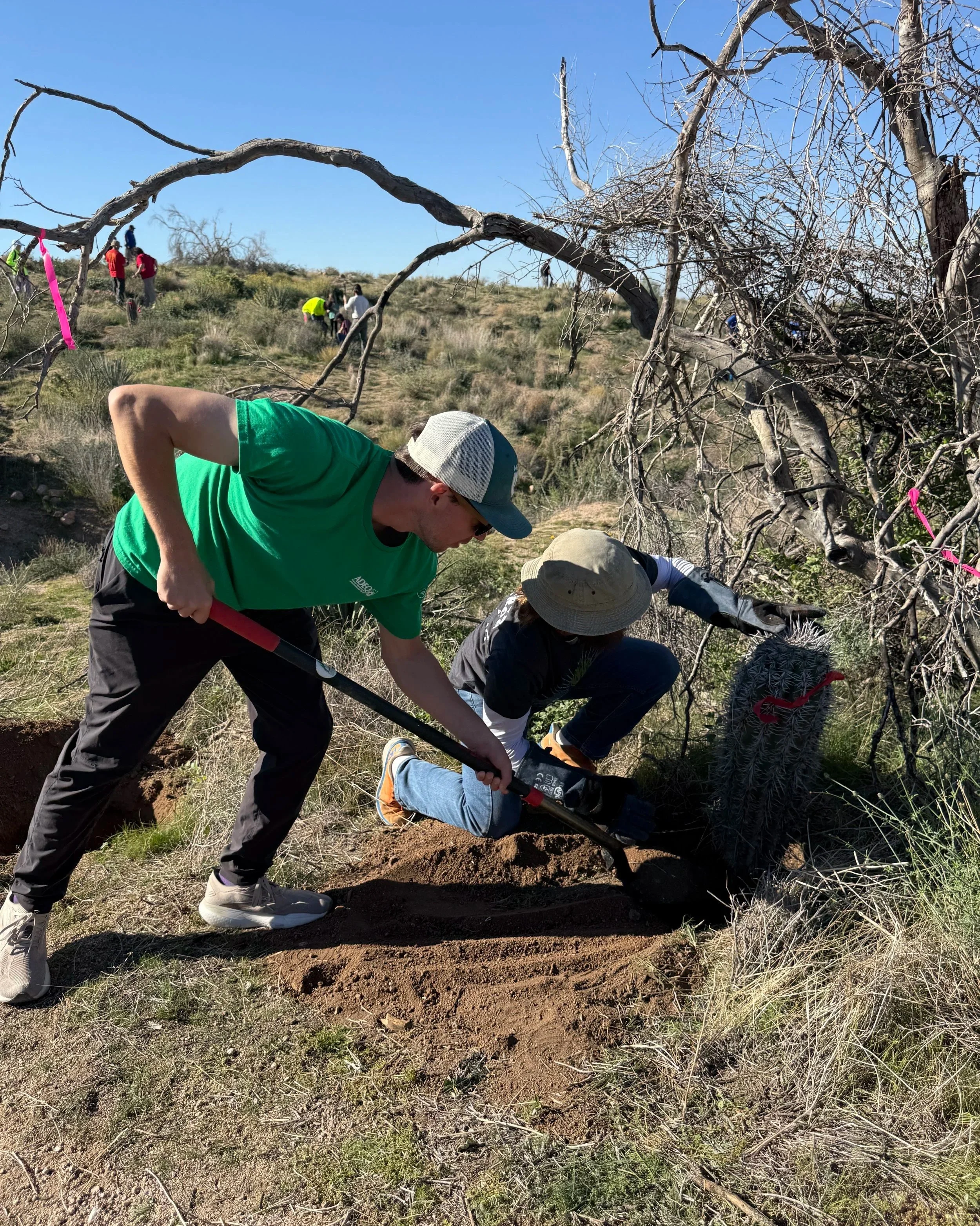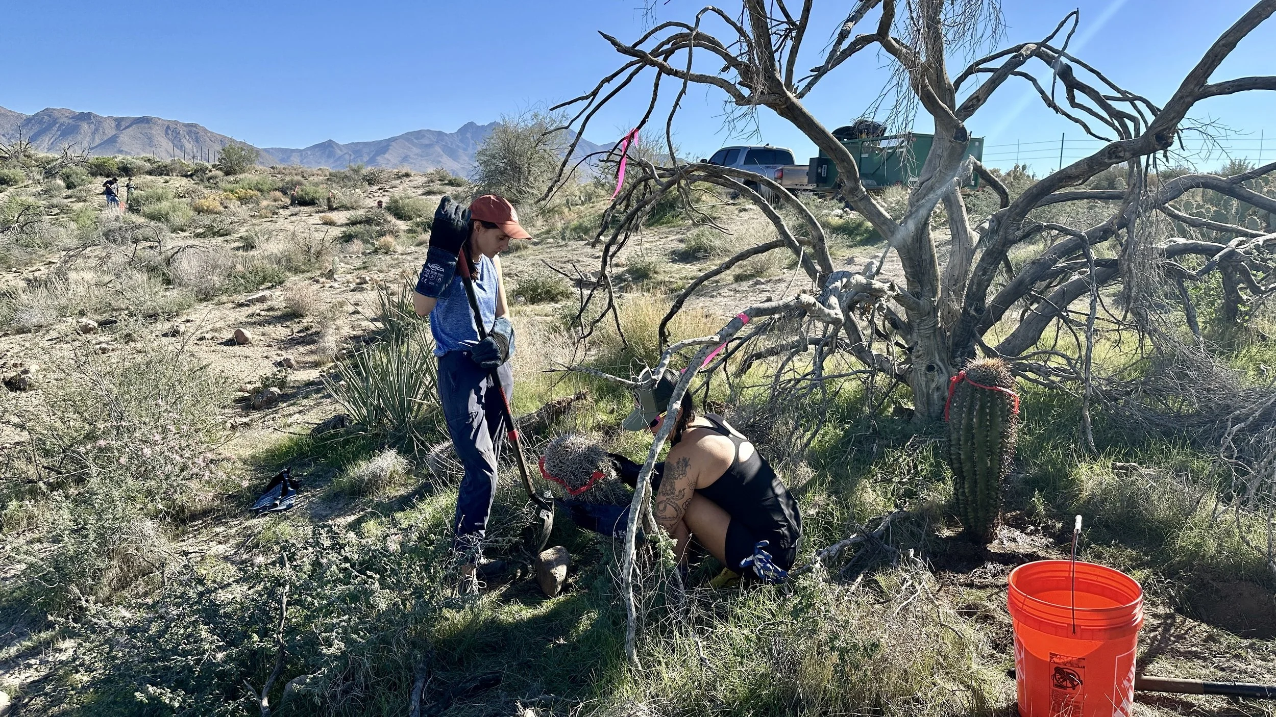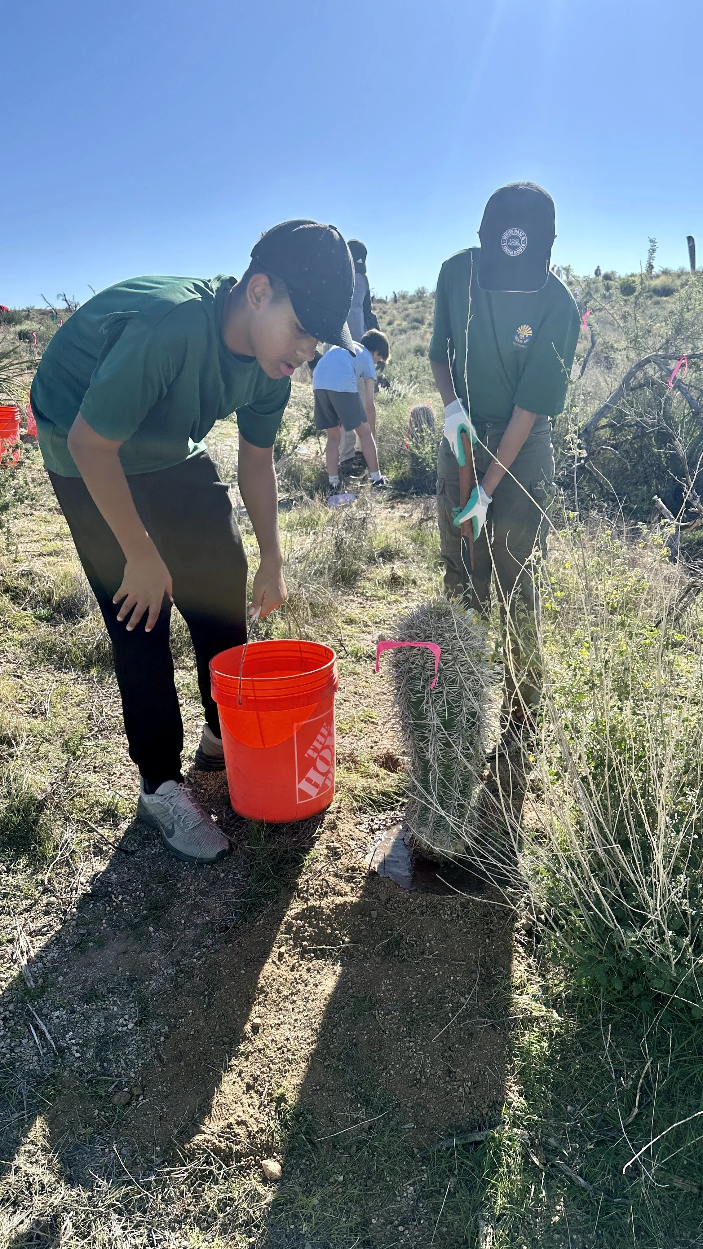 Watering cacti is not only valuable in providing initial water to reduce transplant shock, it also aids in compacting the soil around the freshly planted root network. This was accomplished by providing each newly planted cacti with a little water, no easy task in the middle of the desert. We used the water trailer that we purchased through a grant from the the National Forest Foundation. Thank you to Bec & Julia from the Tonto National Forest Service for bringing it out to the event for us!