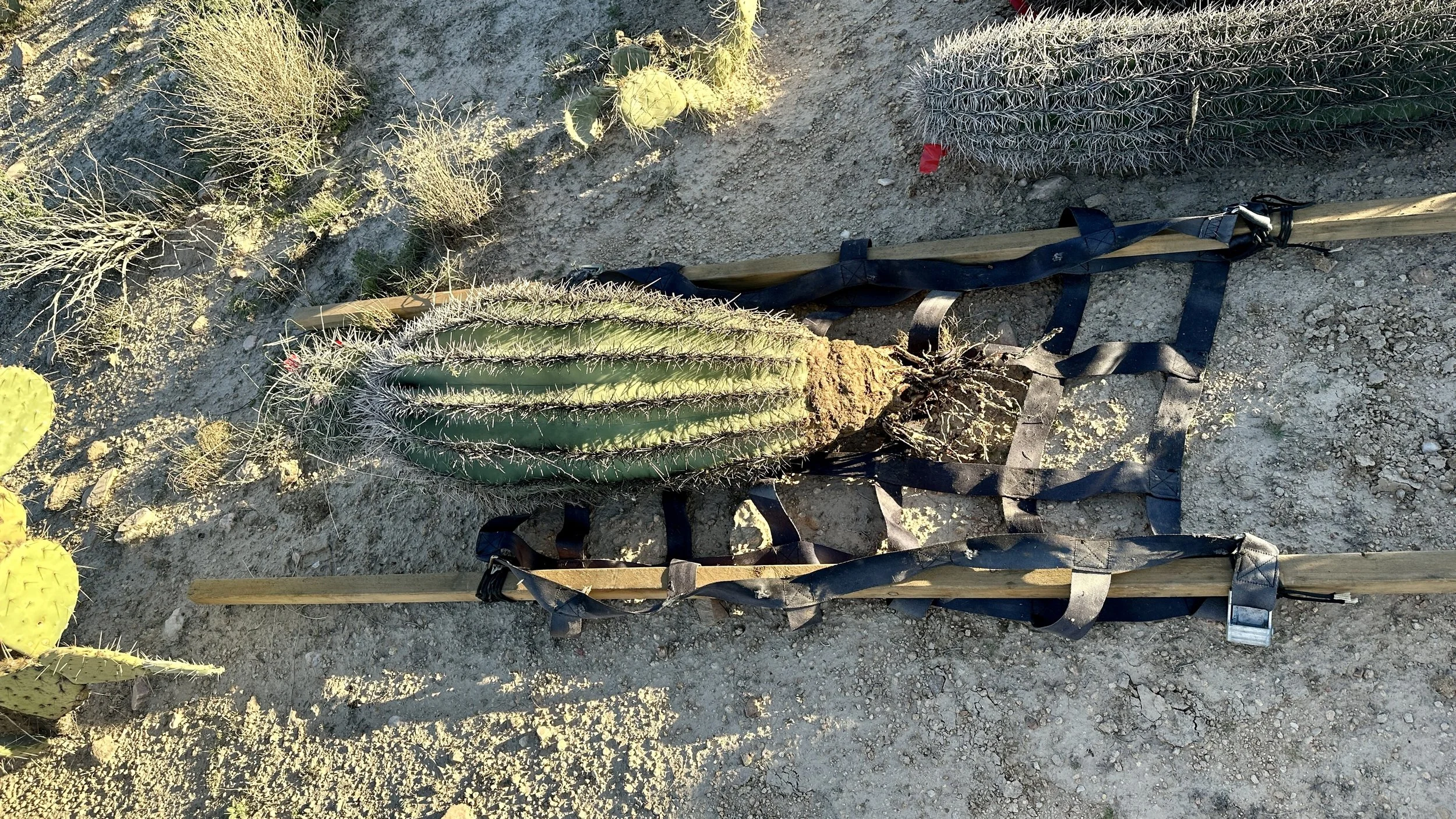 Saguaro skin develops differently on each side, thicker on the sun-facing side, so we must maintain the original orientation (north side facing north). Sometimes we work with saguaro nurseries that mark the south facing side and then we adjust to ensure the south side or those saguaros are planted facing south.