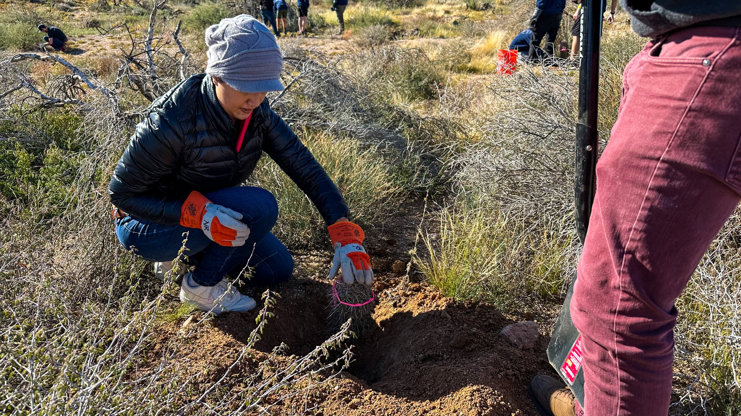 Volunteers spread seed balls and assisted Friends of the Tonto National Forest by removing hundreds of bundles of invasive Buffel Grass, an important part of restoring a burn scar because it helps ensure native desert plants are not choked out by invasive species. Restoring a burn scar goes beyond putting cacti in the ground, we have to look at the big picture and take action to remove invasive plants and trash that can be fuel for fires.